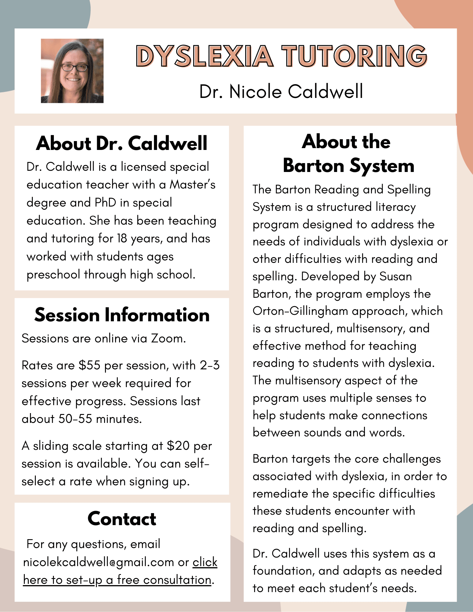 Hi! I’m Dr. Nicole Caldwell and I’m a virtual dyslexia reading tutor. I specialize in reading instruction for autistic students and students with emotional/behavioral challenges, including Oppositional Defiant Disorder. The foundation of my teaching is developing a positive relationship with students to support their confidence, motivation, and emotional co-regulation. The focus is on teaching academics in a safe and supportive environment. I have a sliding scale for all tutoring sessions, so you can select one of the rates that works for your family. Please feel free to contact me to set-up a free initial consultation.
