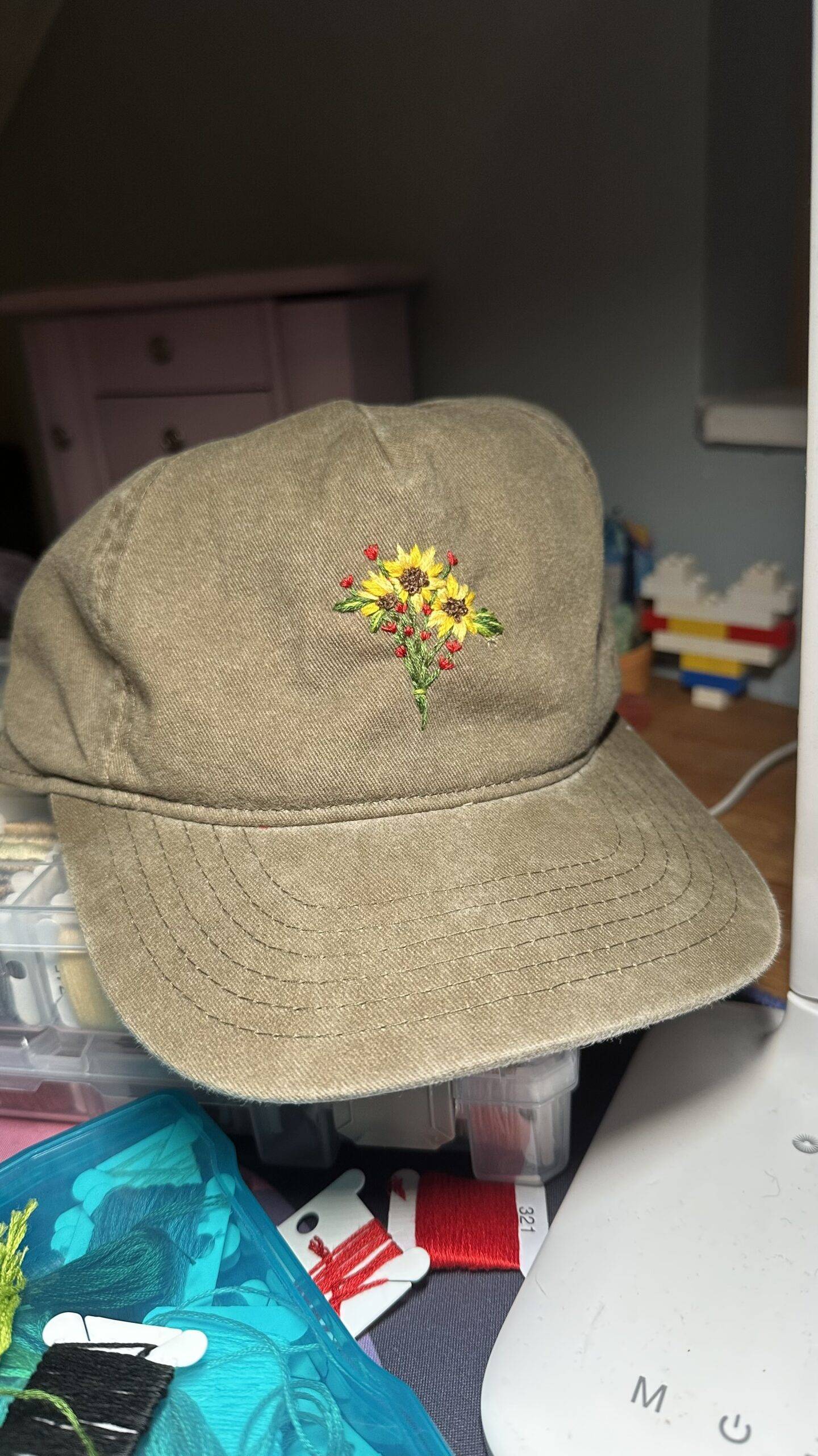 I hand embroider adorable designs onto organic cotton baseball caps!