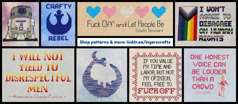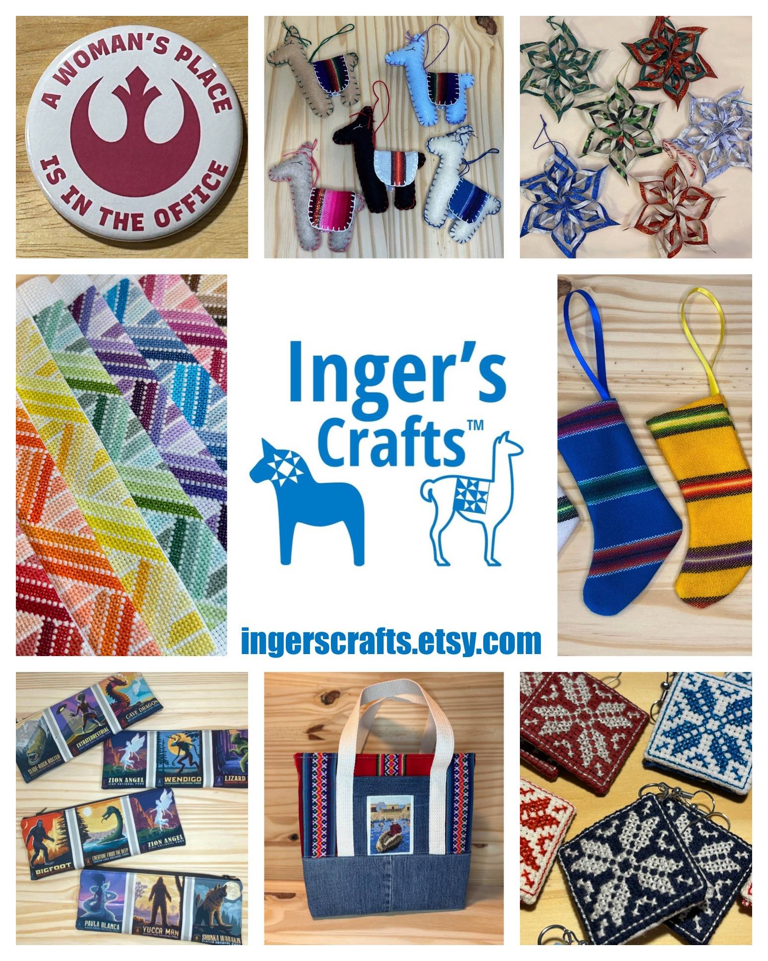 I sell a variety of handmade items and cross stitch patterns. I also have a line of snarky pins, magnets and mirrors. My handmade items include aprons, purses, jewelry, quilts, ornaments, pencil cases, zippered pouches, and more.