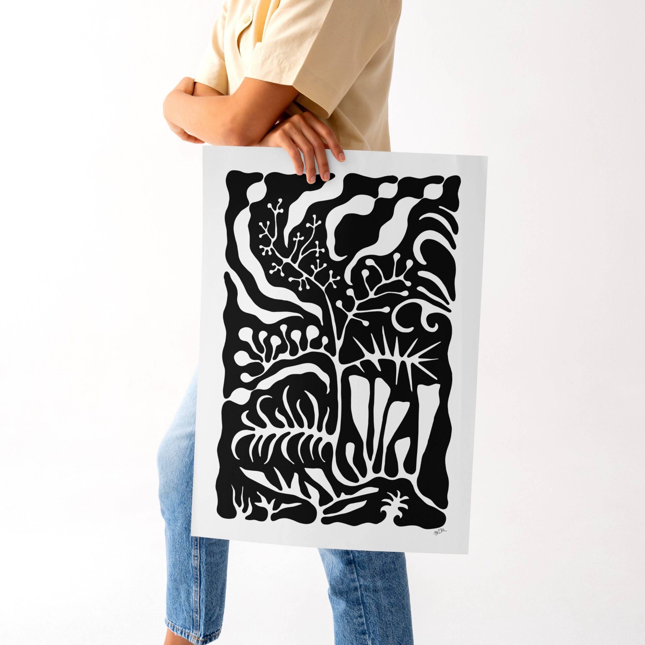 with bold, abstract coral reefs, exotic plants, island and coastal scenes, in black and white or vivid, tropical colors.