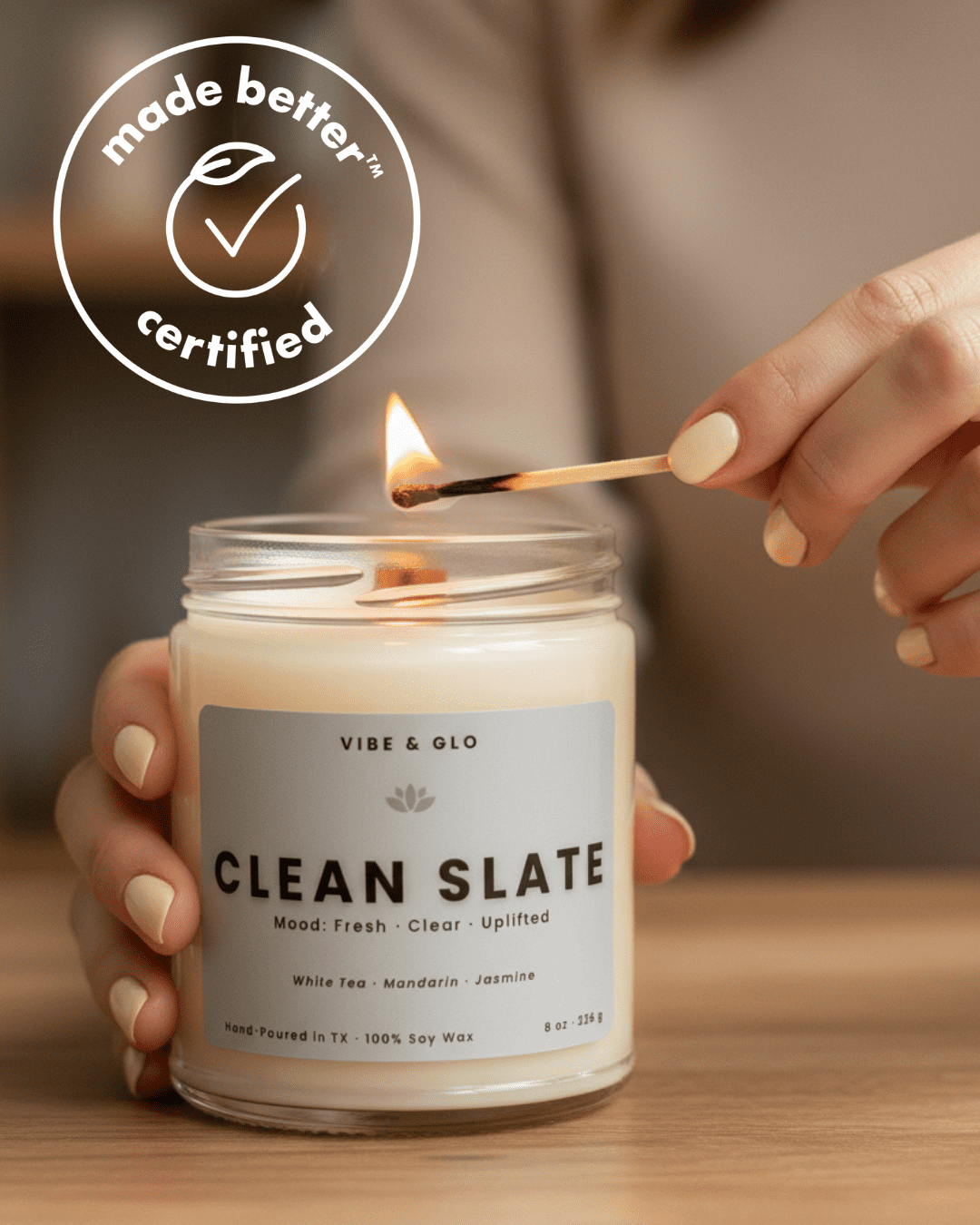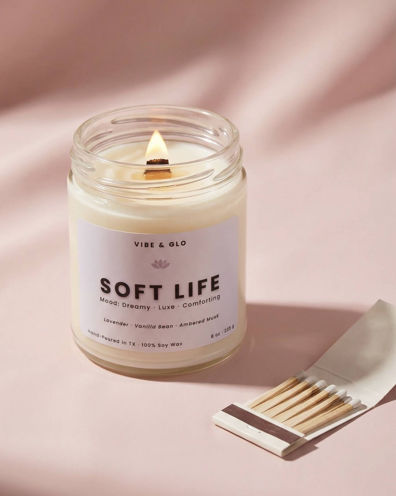 Vibe & Glo began during a season of burnout. In 2024, after years of working long night shifts as a labor and delivery nurse in Houston, I found myself running on empty. I started having terrible panic attacks, and my anxiety was worse than ever. I needed a creative outlet, something that brought peace into my space and helped me breathe again. That’s when Vibe & Glo was born. We craft 100% soy wax candles with crackling wooden wicks to set the vibe. All of our products are vegan, cruelty-free, and made with non-toxic ingredients. 5% of proceeds are donated each month to the Anxiety & Depression Association of America to help spread mental health awareness and provide access to critical mental health resources as part of our mission. Let’s Glo!
